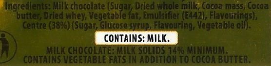 Milk chocolate ( ⁃ Sugar, ⁃ Dried whole milk, ⁃ Cocoa mass, ⁃ Cocoa butter, ⁃ Dried whey, ⁃ Vegetable fat, ⁃ Emulsifier (E442), ⁃ Flavorings), Centre (38%) ( ⁃ Sugar, ⁃ Glucose syrup, ⁃ Flavouring, ⁃ Vegetable oil).