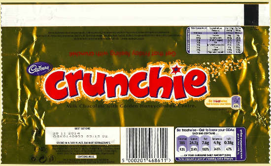 Cadbury’s Crunchie bar consists of - in Cadbury’s words - “Milk Chocolate with Golden Honeycombed Centre.” This is an interesting bar - a bit